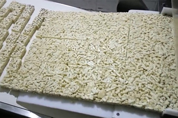 - SMCF-650切块机生产金黄沙琪玛, 客户的现场, 切工整齐有序(沙琪玛切块机,中国式小吃,京城沙琪玛,膨化食品分切机)