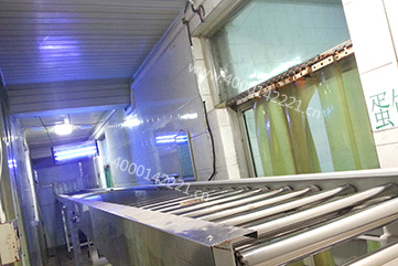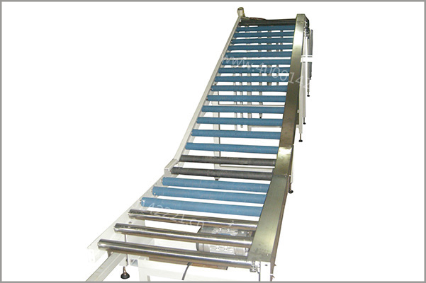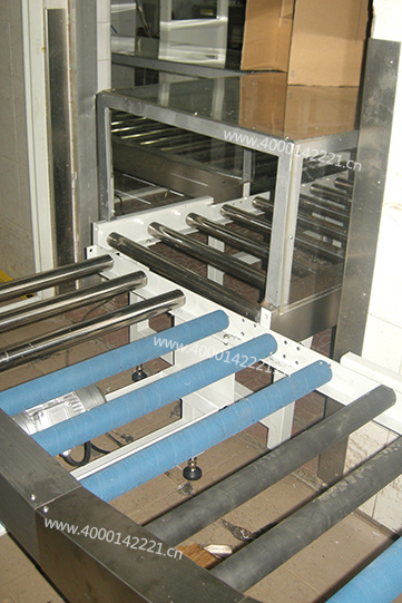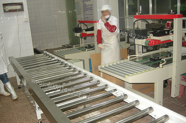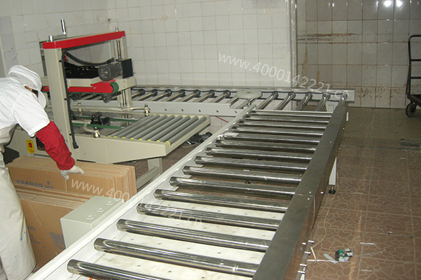 由滚筒输送机拼接而成,与包装机口连接,进料高速且输送量巨大,适合箱体运输;
