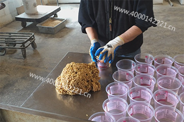 中,一个工人将原料装到0.45kg的塑料盒中。