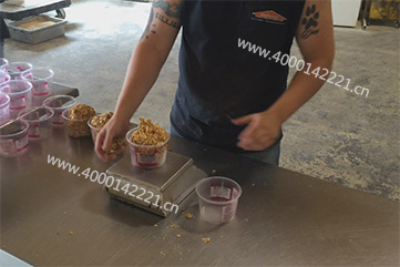在视频例三中,工人对原料进行称重到567克(这个重量应该是包含了塑料盒的重量)。