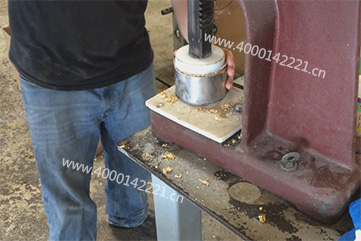 在视频例四 中,称重后的原料盒放在一个液压机下方,将一截塑料管放入盒中,然后和产品一起被压平。消费者买到产品后,可以用一个带有针的固定器穿过圆孔,将产品挂起。这四个视频说的是0.45kg的产品,另外一个1.6kg的产品,形状和做法是类似的,只是尺寸更大。