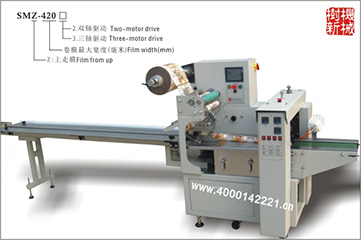 SMZ-420枕式包装机,是我公司销量很好的机型,也是已经成熟的机型,总共卖出了近千台,客户反应都很好,机器采用双轴驱动的结构(伺服+步进电机)配置触摸屏和PLC,调节很方便,袋长在屏幕上直接设置就可以,而且可以储存8组参数,更换规格直接调出该参数即可。