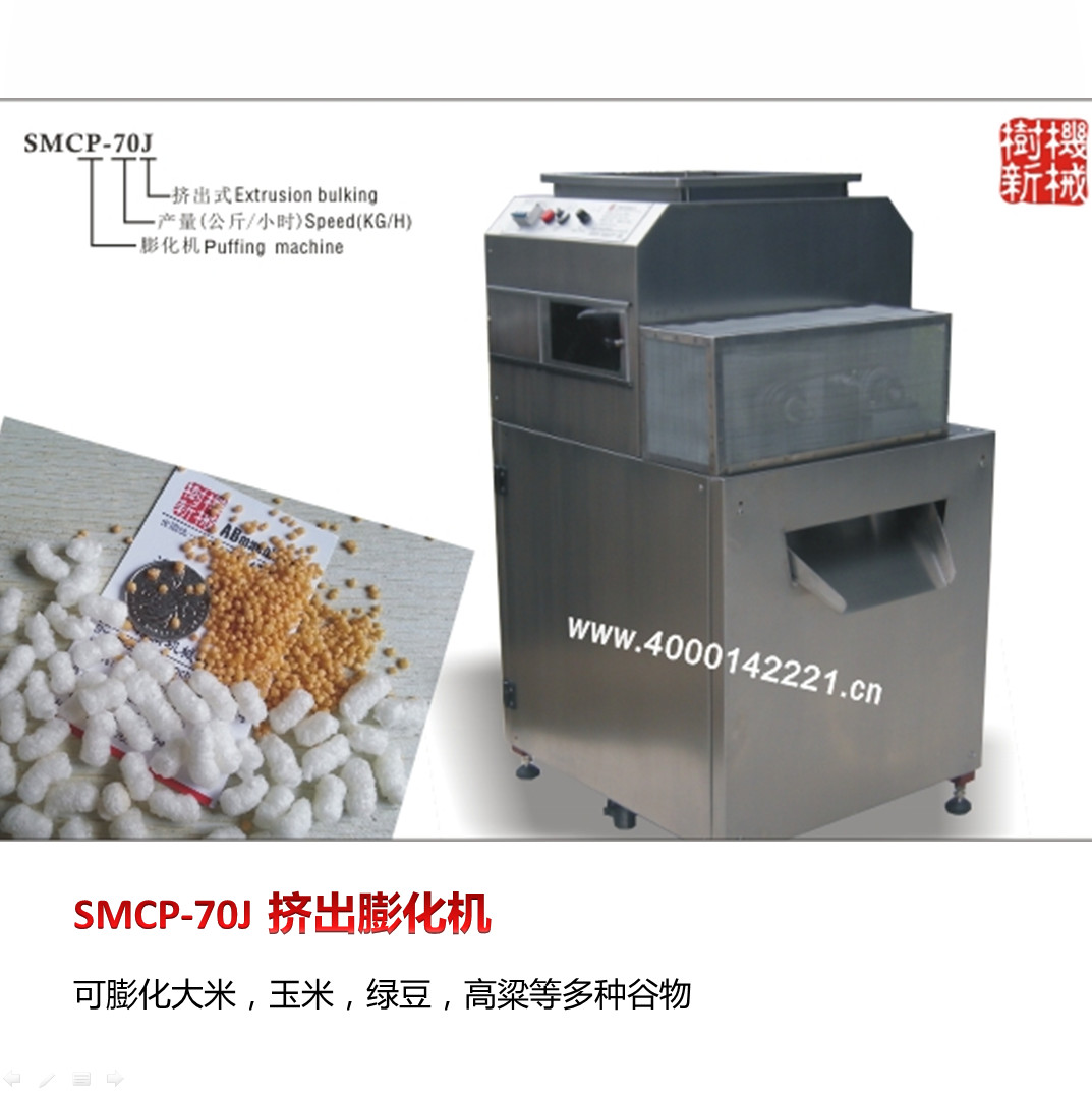 • SMCP-70J 挤出膨化机(米花机),可膨化大米、玉米、高粱、绿豆、黄豆等物料,现升级为全不锈钢外壳! SMCP-50Q 气流膨化机(米通机) 可膨化大米、小米、小麦、青稞、苦荞、玉米、高粱、薏仁、荞麦、豆类等含淀粉的物料.