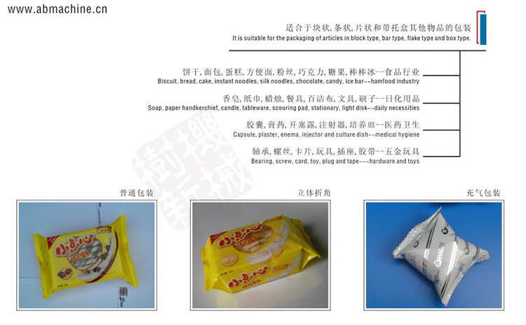 超大的包装范围,能适应很多种尺寸的包装对象:如从糖果到盒装食品的包装,对于月饼的包装,适应范围从迷你月饼到带托的多个包装,同时保鲜剂的包装能做到不漏包.